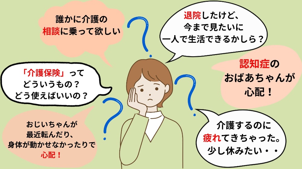 ケアマネジャー(介護支援専門員)が、介護を必要とするご利用者様やご家族様の生活での困りごとについてご相談に応じます。