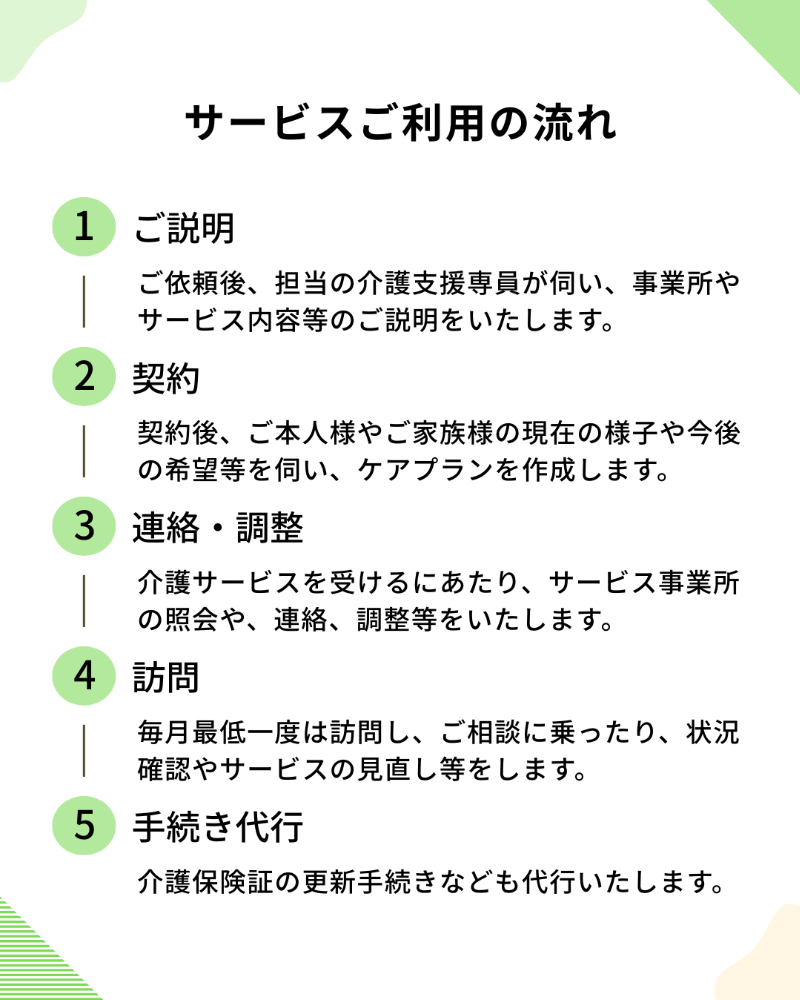 また、介護に関わる手続きの代行や介護サービス事業所の紹介・各機関との連絡、調整なども行います。