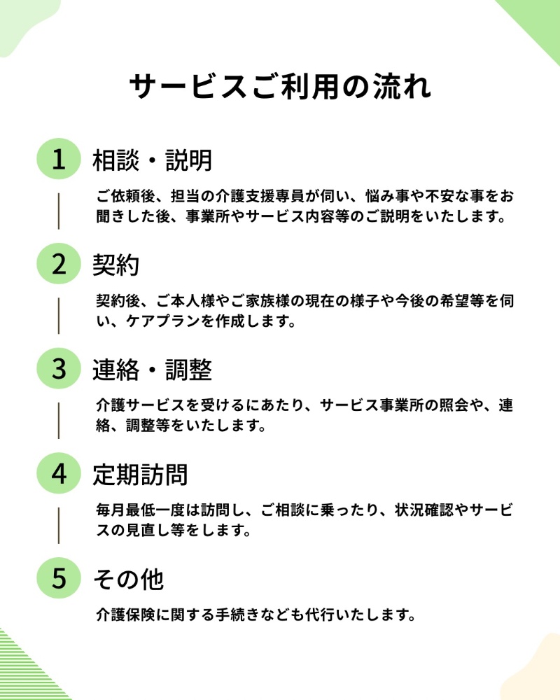 また、介護に関わる手続きの代行や介護サービス事業所の紹介・各機関との連絡、調整なども行います。